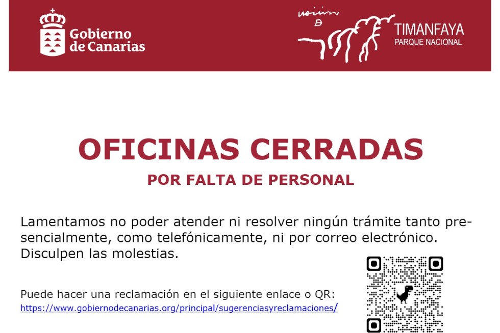 Izquierda Unida Canaria (IUC) ha denunciado la situación de extrema gravedad que atraviesa el Parque Nacional de Timanfaya tras el cierre de sus oficinas administrativas “hasta nuevo aviso” por falta de personal, una circunstancia que impide actualmente la atención telefónica, la gestión de correos electrónicos, el uso de aplicaciones corporativas y la atención presencial a la ciudadanía.